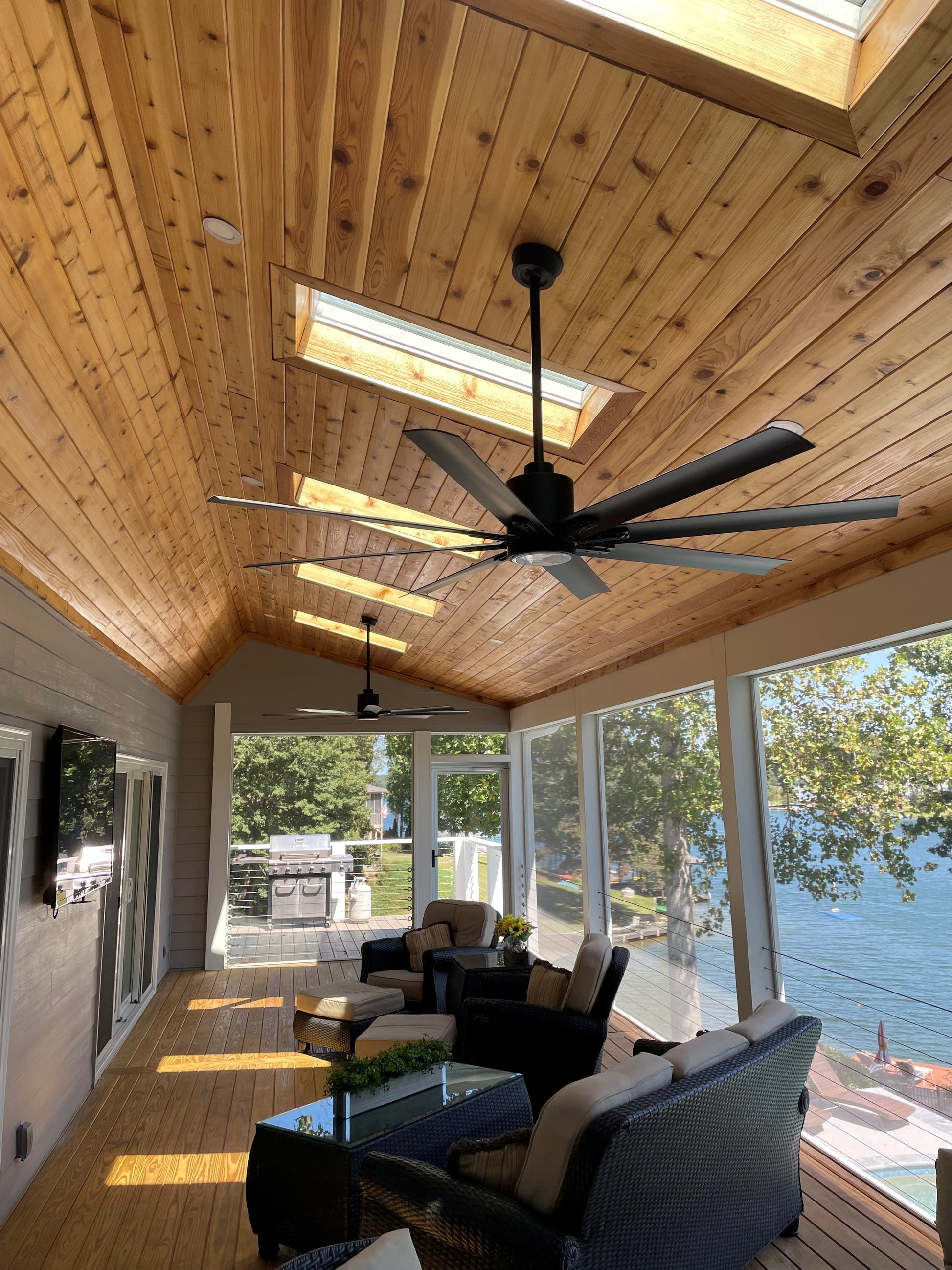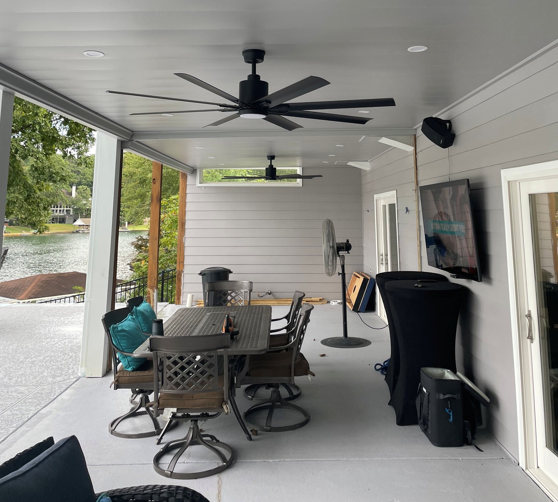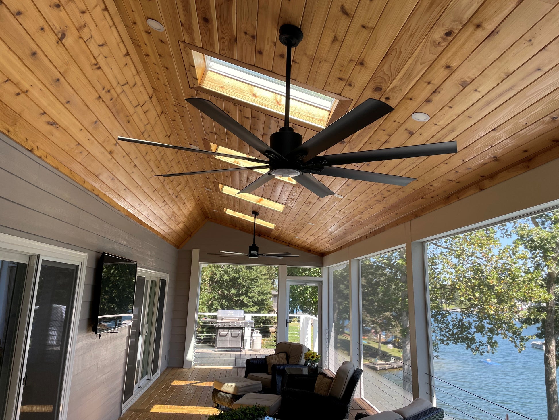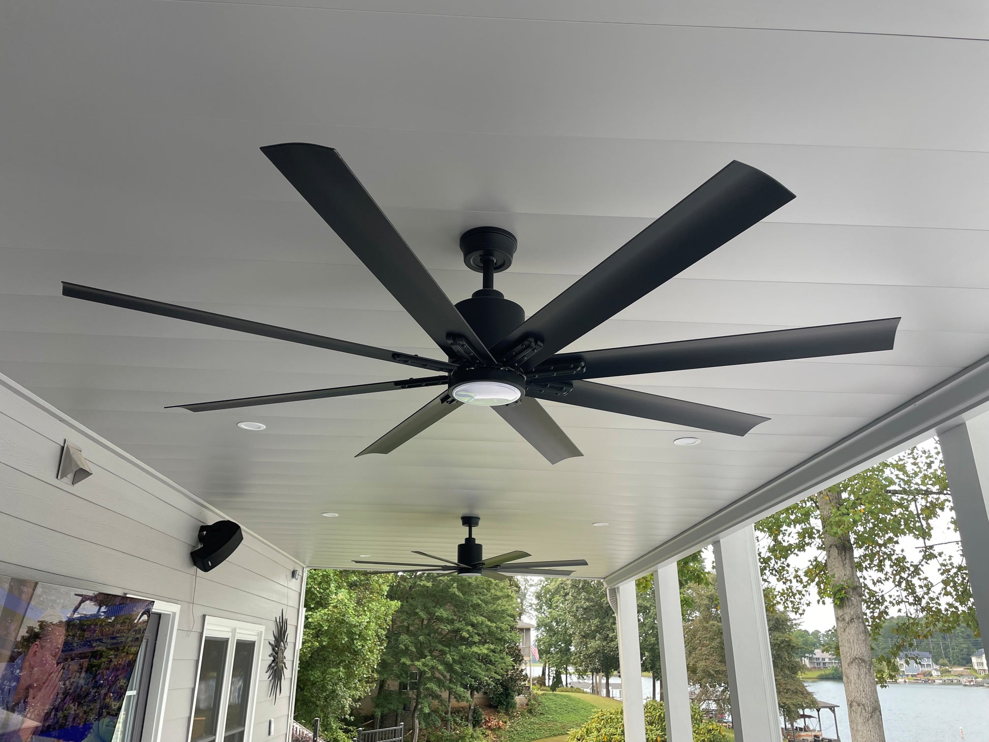 Design & Finish: The Octane features a sleek matte black finish paired with eight (8) durable and lightweight aluminum blades, offering a modern and stylish look. Decorative blade iron accents enhance its visual appeal, while its damp rating makes it perfect for both large indoor rooms and covered outdoor spaces like patios and covered porches.
